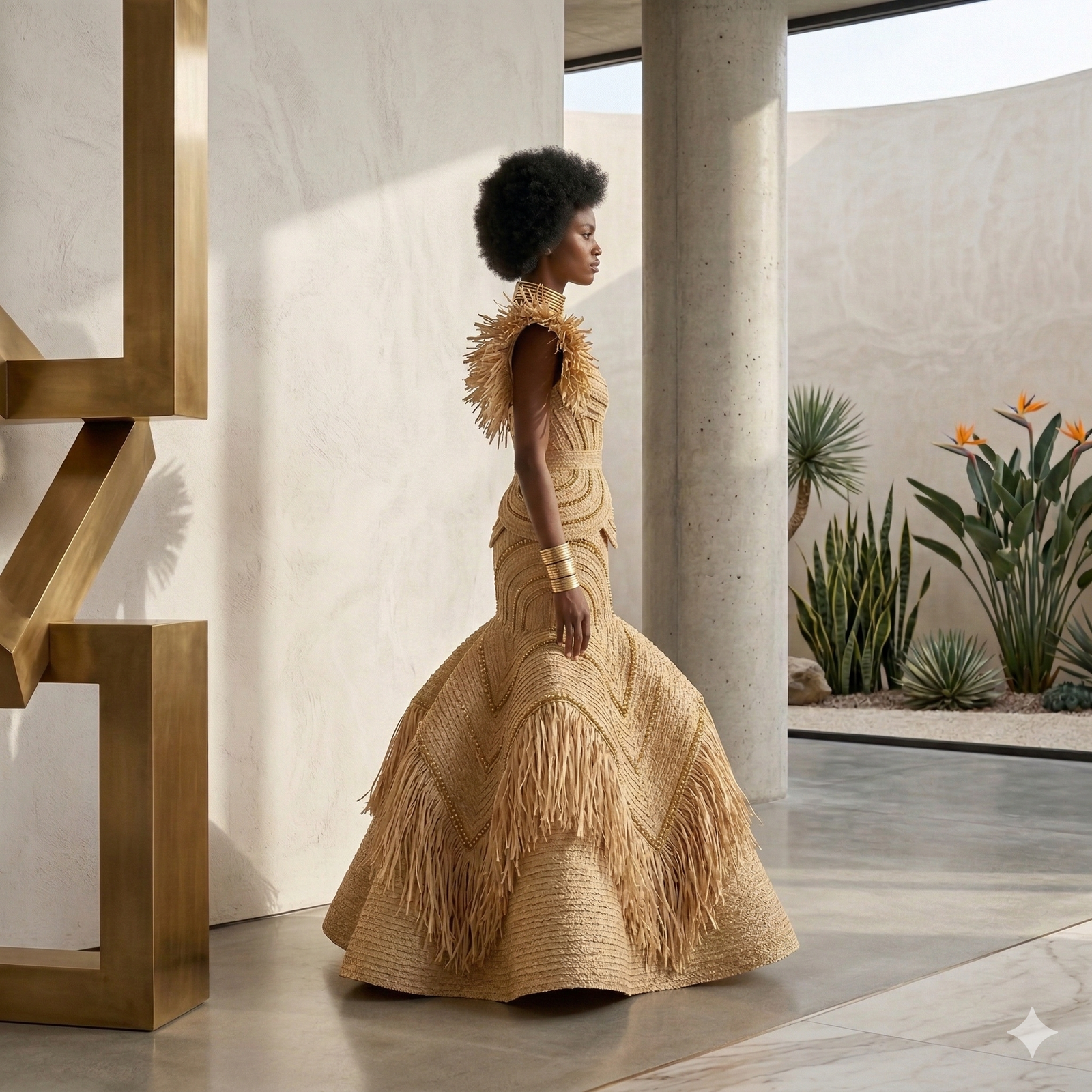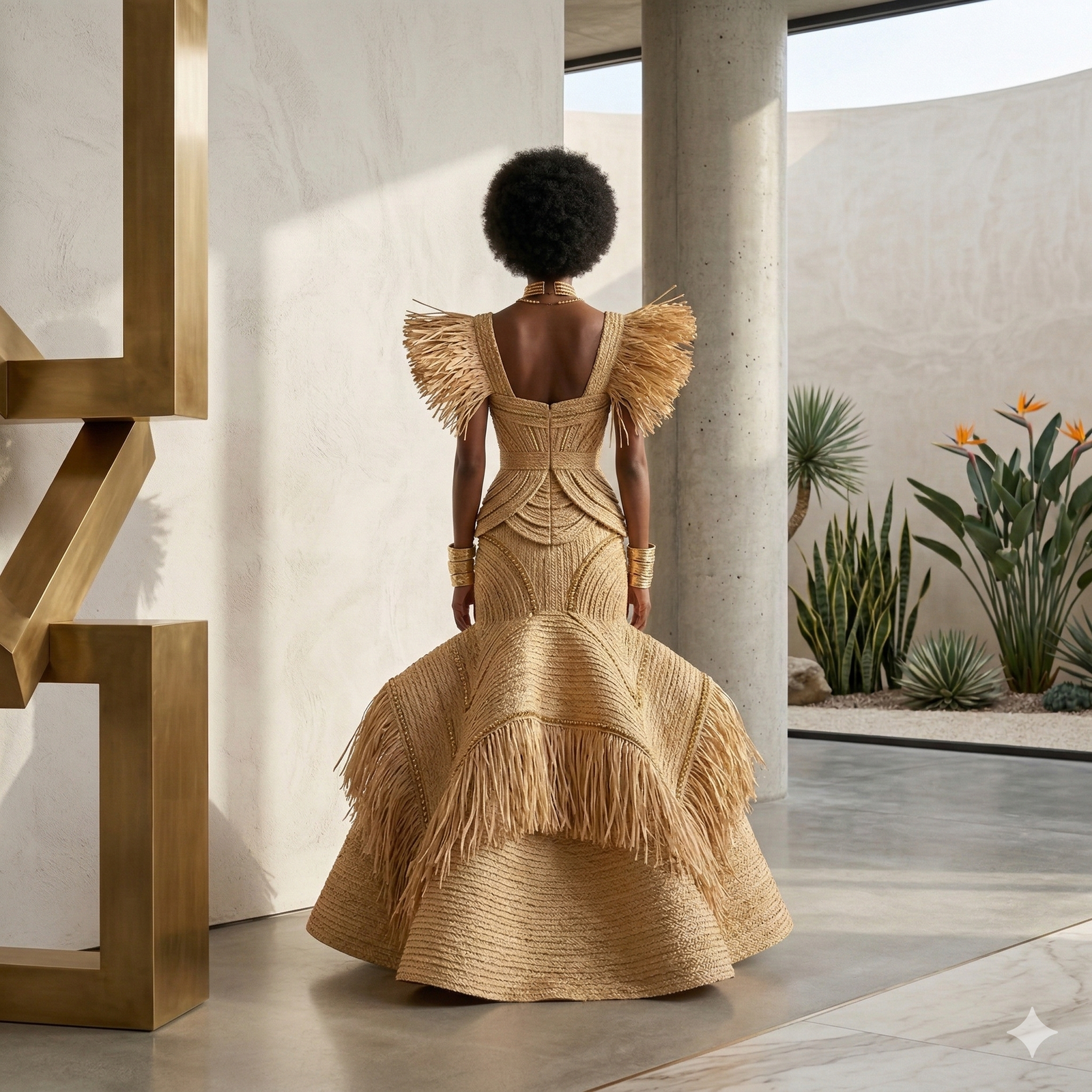 Conseils de Style (Onsite Marketing) « Pour une allure de galerie d’art, associez cette robe à des manchettes dorées minimalistes et un torque sculptural au cou. Laissez la texture du raphia être la pièce maîtresse en optant pour une coiffure épurée et un maquillage naturel. Cette robe se suffit à elle-même : elle est l’expression d’un luxe qui n’a pas besoin de logos pour briller. »